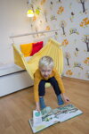 Junior nám v obýváku visí již více jak rok. Děti se tam střídají jak na běžícím páse ... překvapivě zcela bez problémů, ačkoliv sdílení hraček už tak hladký průběh nemá. Když jim ho chci vyprat, to je vždycky křiku. Nakonec ho zpravidla peru, až po usnutí našich malých živlů. Ještě, že jsem manžela udolala pro sušičku. Díky ní vím, že Junior je do rána suchý a zase na svém místě.